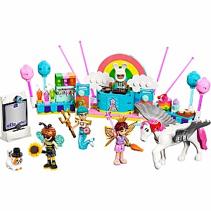 Imaginative storytelling awaits as kids build and play with this colorful costume party scene! Autumn is dressing as a bumblebee and Olly is a merman. Churro the cat joins in the fun in a magician costume with Leo as his white bunny. Paisley wears a fairy costume and Periwinkle the horse transforms into a unicorn. The friends enjoy a party with a stage, DJ booth and snacks. There's also a photo booth with fun accessories where the friends can pose for pictures! To help with the 261-piece build, kiddos can use the intuitive LEGO Builder app.