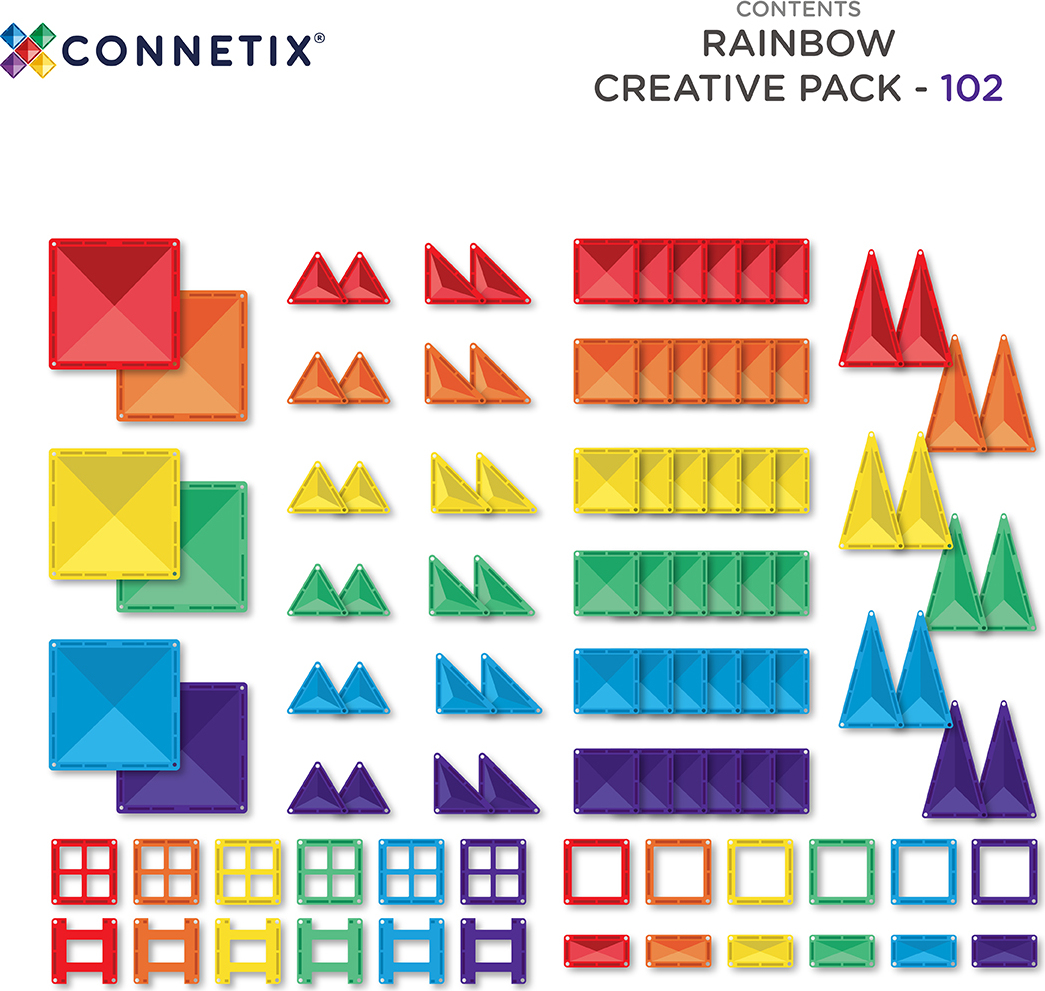 Spark hours of limitless creativity and bring imaginations to life through fun and unstructured play! Featuring a variety of shapes in different colors, including fences and door frames, the CONNETIX 102 Piece Rainbow Creative Pack is the perfect starter option for family play and building bigger CONNETIX creations!